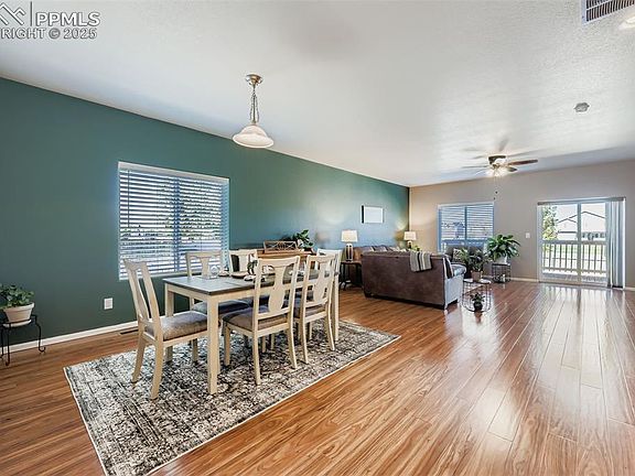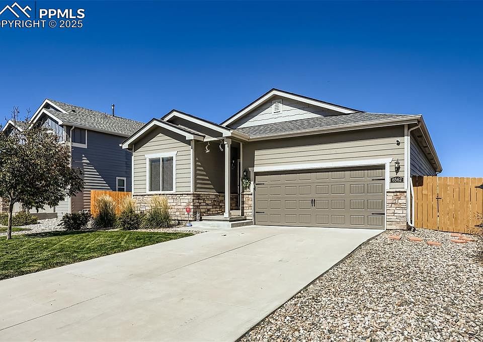 Welcome to this beautifully maintained ranch-style home in the desirable Lorson Ranch neighborhood, offering main level living and Colorado charm. This thoughtfully designed three bedroom, two bath residence features a spacious great room and large dining area—ideal for everyday living and entertaining alike. The kitchen is the heart of the home, showcasing an oversized island, gas cook top, walk-in pantry, and abundant counter space. The expansive laundry room includes a washer and dryer with plenty of storage to keep things organized. The primary room is a peaceful retreat with an oversized tub/shower and large walk-in closet. Step outside to a lovely backyard deck with mountain views, the perfect backdrop for morning coffee or evening gatherings. The landscaped, and fenced yard includes sod with sprinklers, and a mature tree and shrubs. Multiple upgrades to this home include stone-accented siding, a new roof, a new garage door, GE stainless fridge and new disposal, window coverings, regularly serviced mechanical systems, air conditioning, and ceiling fans for year-round comfort. Stylish extended wood laminate flooring flows throughout much of the main level, complementing the home’s open, airy feel. With close proximity to military bases, new schools, parks, and shopping centers, this home blends modern layout with everyday convenience.