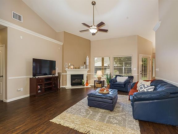 Beautiful sought after Lennar home. Features a large mature landscaped front and back yards to enjoy during family gatherings. Three bedrooms with a separate office/den area. Laminated flooring, high ceilings and a cozy fireplace accent this stunning home. The kitchen has a gas stove, pantry, and breakfast bar for convenient day to day use. Luxurious and private master bedroom features a walk-in closet and separate vanities with a large soaking tub and roomy shower. Three car garage and a solar lease for low utility bills. Newer HVAC system to seal the deal !!!