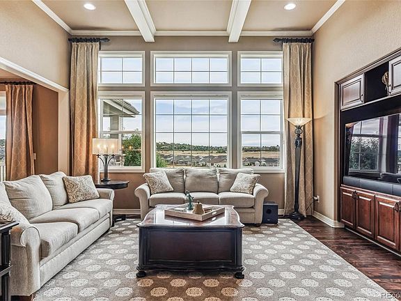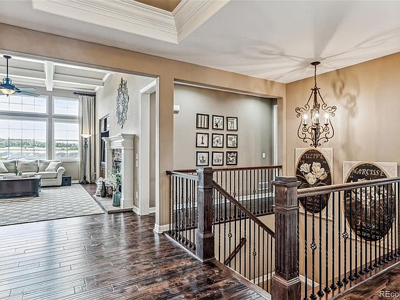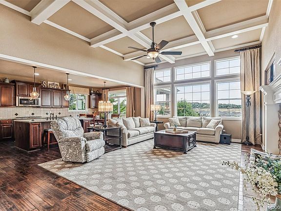Backing to open space, this meticulous 3 car, ranch-style home in Cobblestone Ranch provides over 4,400 finished square feet of living space, starting with an expansive entryway and gorgeous warm hardwoods throughout. Additional trim work, featuring beautifully cased windows plus coffered and tray ceilings, impressively elevates the home to a level of its own. Picture windows in the living room showcase Colorado’s famous sunsets and provide abundant natural light. The gourmet kitchen is a chef’s dream, equipped with high-end built-in Monogram refrigerator, gas range, double ovens and newer Bosch dishwasher. The oversized island offers ample prep space and additional storage. The main floor boasts 4 spacious bedrooms and 3 baths, providing a comfortable, functional layout. The primary suite is a peaceful retreat with a luxurious jetted soaking tub, a large walk-in closet with custom storage, and serene views. The finished walk-out basement is designed for entertainment or relaxation. It features a spacious 5th bedroom with a private ¾ bath, a large recreation/ media area with gas fireplace and full wet bar. With over 1,100 square feet of unfinished space, there’s plenty of room for storage or future finish. Outside, the covered deck and patio extend the living space, offering breathtaking views of the surrounding landscape and year-round enjoyment. The community offers fantastic amenities, including multiple pickle ball, tennis, and basketball courts, play structures for all ages, bike skills area, pool, clubhouse, acres of open space, trails throughout, and access to the Cherry Creek Trail system. Located less than 15 minutes from downtown Parker, the Castle Rock Outlets, shopping, dining, and much more, this property comes with a lifestyle that combines luxury living with the beauty of Colorado’s natural surroundings. Own some of the best views and best upgrades the area has to offer!