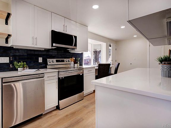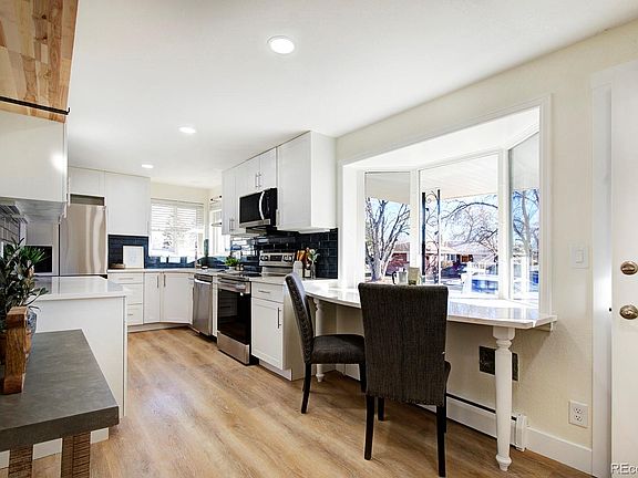 Inside your remodeled kitchen features beautiful Calacatta gold quartz countertops, and kitchen sitting area, new LG appliances, unique glass washer on your new sink, soft-close cabinetry, open shelving on new LVP flooring. You will enjoy a cozy family room with three bedrooms featuring hardwood floors and a large main floor bathroom complete with a new vanity. Your professionally finished basement has two new conforming bedrooms and enlarged bathroom with new vanity and tile. You'll love the custom oversized laundry room with built-in cabinetry, Calacatta gold quartz, new LVP flooring & utility sink. A new electrical panel inside and in the garage make this unique home completely move-in ready! Nearby activities are abundant, as this home is minutes from Olde Town Arvada & Apex Community Rec Center and has a lot of parks and close proximity to schools.