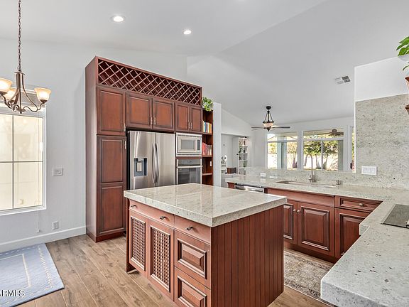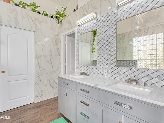 This gorgeous home is waiting just for you in Mesa! This one-story gem features a convenient 3-car garage and great curb appeal. Just wait until you see the natural light in this home! Enter the home to discover a bright & light interior with open common areas, wood-look tile flooring throughout, neutral paint, and vaulted ceilings. The impeccable eat-in kitchen offers handsome custom wood cabinetry, granite counters/backsplash, high-end SS appliances, and a center island. The main bedroom is a delight to rest after a long day, complete with an upscale ensuite boasting dual sinks, a step-in designer tiled shower, and a walk-in closet. Outback, the large backyard provides an extended covered patio and grassy area for relaxing evenings. Make sure not to miss this fantastic opportunity!