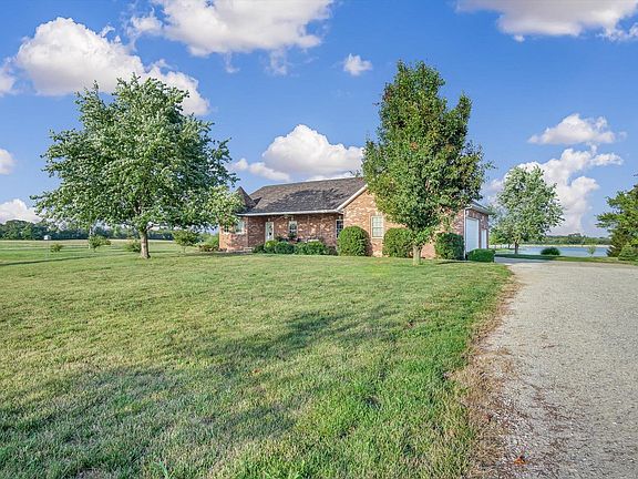 Embrace the ultimate luxury living with this stunning 3-bedroom, 3-bathroom, brick ranch on 2.5 acres. Enjoy a serene, 10 acre lake in your backyard and sunsets over a country view in the front. The new custom kitchen is a culinary masterpiece, featuring a large center island, Quartzite counters, double oven, drawer microwave, two sinks, and ample cabinet space. The living room and dining room impress w/ vaulted ceilings, opening to a deck w/ a spectacular view. Indulge in the large primary suite, w/ a double vanity, whirlpool tub, and separate shower. The finished walkout basement presents a spacious family room, rec room, and flex space. Enjoy the convenience of a 3-car garage, extended laundry room, and covered outdoor kitchen on the back patio. W/ 3322 sq. ft of living space, this home is both grand and cozy. Recent updates include 2020 roof, refinished hardwood floors, interior paint, brick mailbox, fiber internet. Don't miss the chance to own this picturesque lakefront ranch!