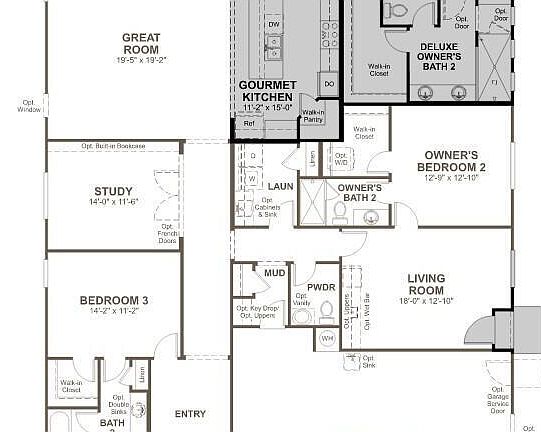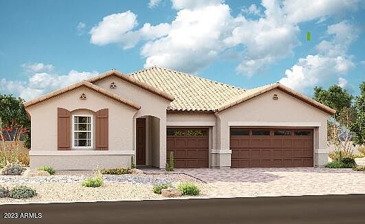 Welcome to this inspired Darius home. Included features: a covered entry; two secondary bedrooms with a shared bath; a beautiful study; a gourmet kitchen boasting 42'' upper cabinets, quartz countertops, stainless-steel appliances, a walk-in pantry and a center island; a cozy nook; an expansive great room with multi-slide patio doors; a well-appointed primary suite showcasing a walk-in closet and a private bath with double sinks; central laundry and powder rooms; a secondary suite featuring a bedroom, an attached bath and a living room with a laundry closet and an exterior door; a tranquil covered patio and a 3-car garage. This home also offers dramatic 10' ceilings, 6'' x 36'' stone tile flooring, cultured marble bath countertops, additional windows and ceiling fan prewiring in select roo