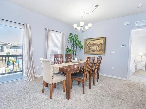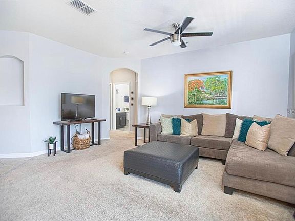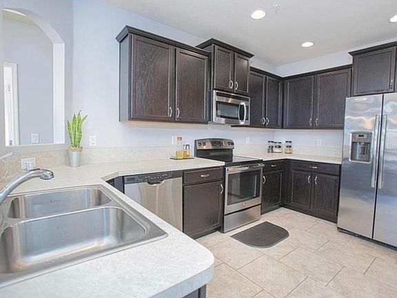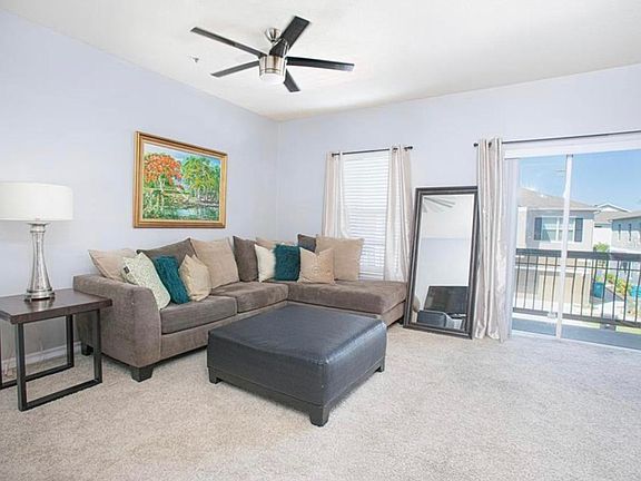 Corner and move in ready home in the beautiful gated community of Carter Glen. Features an open floor plan full of natural light. Updated kitchen with plenty countertops and storage space, recessed lighting, stainless steel appliances and breakfast bar for casual dining. The spacious master suite features a walk in closet and private en-suite bathroom with dual sink vanity and soaking tub/shower. A second spacious bedroom and full guest bathroom completes this ideal unit. Spend your mornings enjoying a cup of coffee and the Florida breeze on your balcony. There is plenty of room for a car or storage in the attached garage. This quiet and maintenance free community offers residents a resort style pool with water view, hot tub, cabana, fitness center and children's playground. Landscaping and exterior maintenance as well as gate and 24 hour security is included. Innovation Middle school and Lake Nona High School zoning. Small pet allowed with additional $500 deposit.