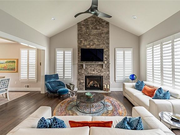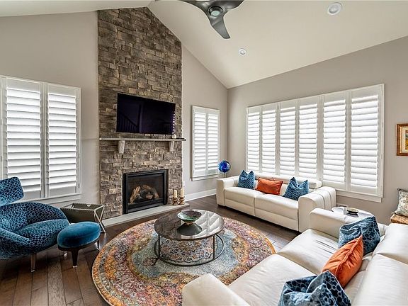 - Description: Vaulted ceiling, stone fireplace wall to ceiling