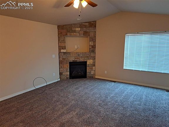 Open floorplan, ranch style living with a gas fireplace in the living room. The kitchen features granite countertops, lots of pantry space, stainless steel appliances, A/C, front and backyard have xeriscape landscaping with rocks and low maintenance bushes. Direct mountain views of Pikes peak with open land behind the home. Enjoy the nightly sunset on the back deck; there is a walk out from the master bedroom. Master bedroom has a large walk-in closet. Kitchen, baths and dining area have ceramic tile. This location has woodmen hills metro district for water so there is access to the community center, pool (both indoor and outdoor), weight room/exercise room. Due to this there is an additional fee added to the water bill. This is listed as hoa2. Carpet to be replaced before closing.