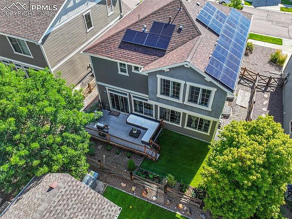Discover this stunning 5-bedroom, 4-bathroom home with a 2-car garage, nestled in the highly sought-after Banning Lewis Ranch community. This energy-efficient home includes "free & clear" solar panels, two furnaces and main level central air conditioning, offering both modern convenience and cost savings. Step into the spacious kitchen, where you'll find an abundance of cabinet space, elegant stone countertops, an oversized island, and beautiful wood floors. Stainless steel appliances add a sleek touch, while the kitchen seamlessly flows into the living room, creating an inviting space for gatherings. Enjoy easy access to the outdoors via the walkout to a Trex deck, perfect for entertaining. The main level also features a formal dining room and a convenient half bath. Upstairs, you'll discover four generously sized bedrooms, including a luxurious master suite. The master bathroom is a true retreat, featuring a walk-in shower with an oversized Pebble Stone Shower with a Rain showerhead, natural stone countertops, and double vanities. The finished basement offers additional living space, with a large family room, a full bathroom, a fifth bedroom complete with its own walk-in closet and a dedicated furnace to keep the temperature pleasant in the winter. The home is also equipped with a radon mitigation unit for added peace of mind. Located in a community that boasts award-winning charter schools, a clubhouse with a 24-hour fitness center, outdoor swimming pools with a fun zone, tennis courts, parks, and miles of hiking trails, this home truly offers the perfect blend of comfort and convenience.
