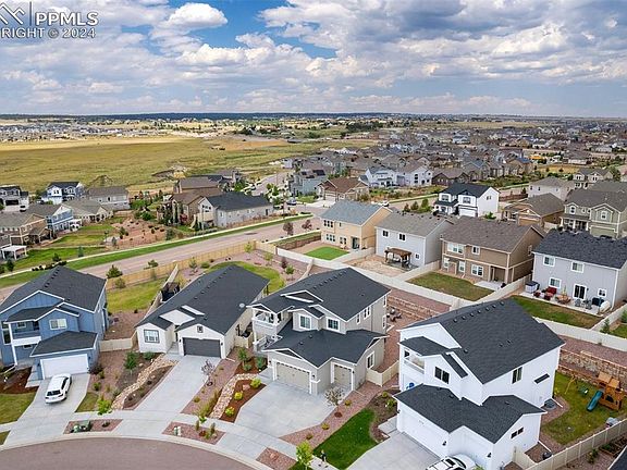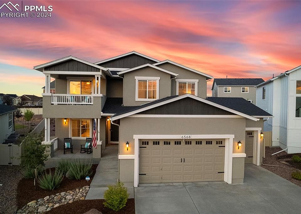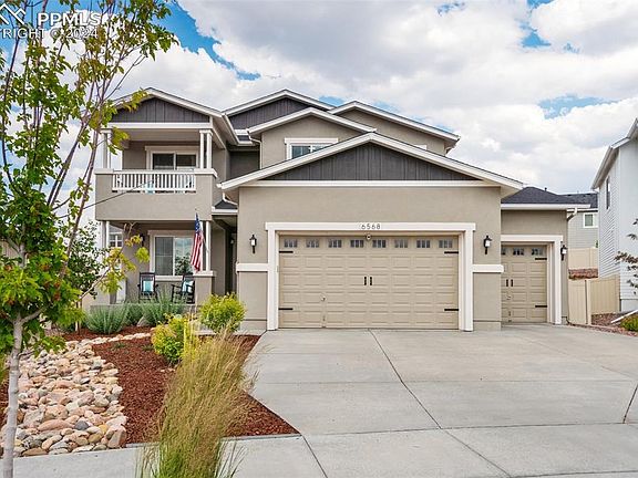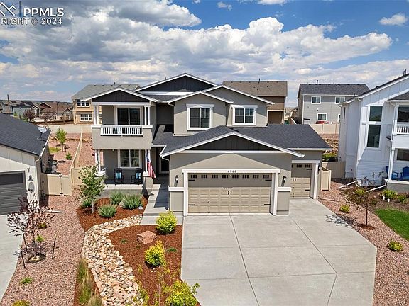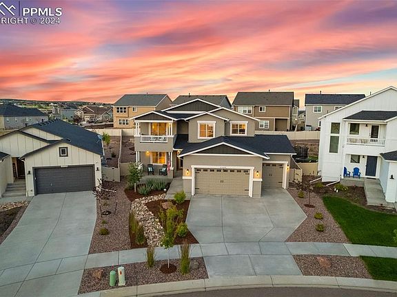 Spectacular Mountain Views from most bedrooms, the front porch, and private balcony! A must see 4-car garage with over 1000 sq ft and 8 ft tall garage doors is not an easy find! There is an EV outlet, room for a workshop, a large truck, and tons of storage! Enjoy the outdoors from the fully landscaped yard with oversized 40 x 10 patio in back yard; covered front porch; or private master balcony. Inside, the kitchen features hardwood floors, quartz slab countertops, soft-close cabinetry, a pantry, and Whirlpool stainless steel appliances with gas range. You will find a huddle room/flex space just off the kitchen for that essential extra space! This could be a huge walk-in pantry, coffee bar or expanded kitchen space with mountain views. The kitchen and dining hardwood floors flow seamlessly into the two-story great room, a gas fireplace with stone surround is the focal point. The main level includes an office/potential additional bedroom #5, a full bathroom, and separate mudroom with access to the garage. Four bedrooms and secondary full bathroom are located upstairs. The laundry room is upstairs and convenient to the bedrooms. The primary bedroom suite includes a spacious walk-in closet, ensuite bath with dual vanities and a walk-in shower. Walk out to your private balcony with stunning views of Pikes Peak and the Rocky Mountains! The basement features a family room, perfect for movie nights! There is ample unfinished space with many options including: fitness room, theatre room, or future bedroom #6. It is perfect for storage. Fully landscaped, Wi-Fi sprinkler system, artificial turf, window well covers, rear yard vinyl privacy fencing, radon system, air conditioning and humidifier. West facing driveway. The award-winning Jackson model by Keller Homes is one of their most popular 2-story plans. Coveted Academy School District 20 Schools, close to recreation, shopping, hospitals, restaurants, and bases.