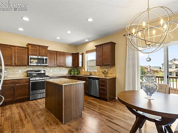 LOCATION ~ LOCATION ~ LOCATION ~ GORGEOUS PIKES PEAK & MOUNTAIN RANGE VIEWS FROM THIS STUNNING, IMMACULATELY CARED FOR, LIGHT & BRIGHT PROPERTY LOCATED ON UNIQUE DOUBLE CUL-DE-SAC IN INDIGO RANCH ~ ENTER TO GLEAMING HICKORY HARDWOOD FLOORING THROUGHOUT THE OPEN FLOORPLAN MAIN LEVEL W/FRENCH DOORS TO OFFICE / FLEX SPACE OR A 5TH BEDROOM POTENTIAL ~ BEAUTIFUL SLAB GRANITE KITCHEN COUNTERS W/ISLAND, MAPLE CABINETRY, STAINLESS APPLIANCES, 5-BURNER GAS STOVE PLUS SEPARATE PANTRY ~ ADJOINED BY DINING AREA & WALK-OUT ACCESS TO LARGE DECK W/STAIRCASE TO GROUND LEVEL AS WELL AS A SPACIOUS LIVING ROOM W/GAS FIREPLACE AND CUSTOM BUILT-INS ~ HIGH-END LIGHT FIXTURES THROUGHOUT HOME ~ UPPER LEVEL FEATURES LARGE PRIMARY SUITE W/TWO SEPARATE WALK-IN CLOSETS & 5-PIECE BATHROOM ALONG WITH TWO GUEST BEDROOMS ~ WALK-IN LAUNDRY ROOM W/COUNTER SPACE & CLOSETS ~ WASHER/DRYER ARE INCLUDED ~ WALK-OUT BASEMENT WITH 5-SPEAKER SURROUND SOUND IN SPACIOUS FAMILY ROOM ~ A 4TH BEDROOM ~ FULL BATHROOM & STORAGE ROOM WITH WALK-OUT TO EXPANSIVE WEST-FACING CONCRETE PATIO PERFECT FOR ENTERTAINING ~ NOTE THE ATTRACTIVE, LOW-MAINTENANCE LANDSCAPING FRONT & REAR ~ THIS HOME HAS A/C & A SMART ECOBEE THERMOSTAT ~ A WHOLE HOUSE HUMIDIFIER & OVERSIZED GARAGE W/EPOXY FLOOR & PLENTY OF STORAGE ~ CENTRAL NORTHEAST LOCATION WITH EASY ACCESS TO SHOPPING AND ENTERTAINMENT, I-25, HWY 24, POWERS BLVD. & WOODMEN / MARKSHEFFEL / SCHRIEVER & PETERSON AFB ALONG WITH USAFA ~ A MUST SEE HOME !