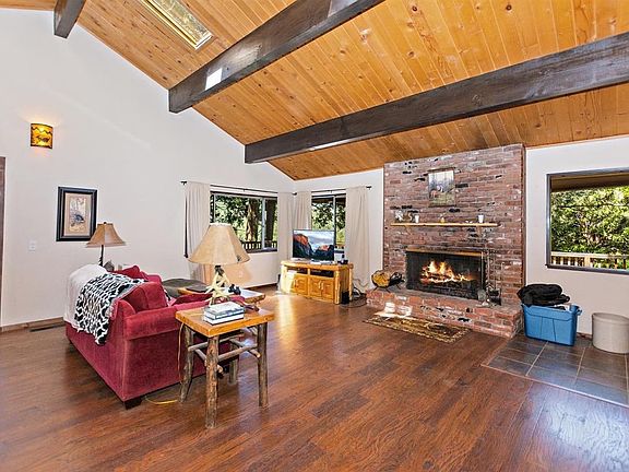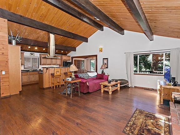 Picturesque Escape with beautiful tree, ridgeline & Lake Gregory lake views! Good sized lot & lots of parking! This home has that great mountain feel with and open floor plan, vaulted beamed ceilings, skylights & wood burning brick fireplace. Lots of windows to let the light in. Nicely remodeled kitchen with newer appliances & breakfast bar. Separate dining area with access out to spacious deck area. Main level also has 2 bedrooms, one is a master suite with its own bath. There is also another bathroom & laundry room. Small loft area would be great for storage or a kids play room. The bottom level is a separate bedroom & bathroom with it's own entrance. Yard is fully fenced too! Great sense of privacy on your own little knoll above the street. Home is in move in ready condition. Excellent access, not too far from the lake or town of Crestline. Don't wait too long or you will miss out on this amazing getaway!