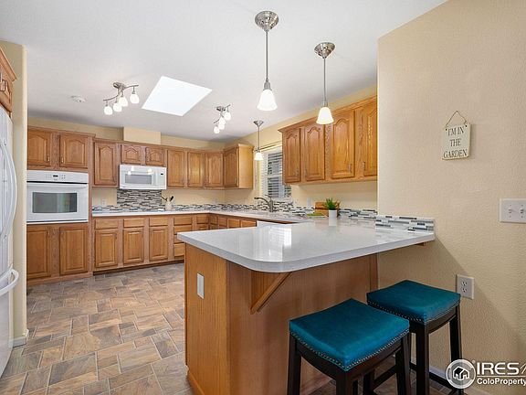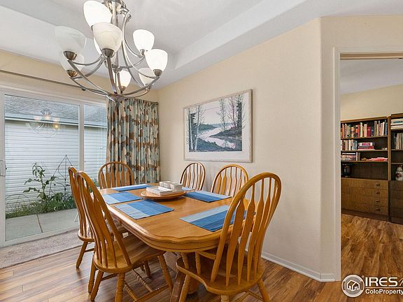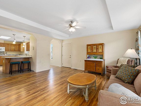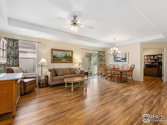 Welcome home! This is one of the best lots in Sunflower, backing to open space with the Colorado mountain views and sunsets you're looking for! Sunflower is a 55+ gated community. Updated with quartz countertops, beautiful vessel sinks, and LVP flooring throughout, you'll not need to do a thing but move in. As you enter this 2 bed, 2 bath + office home, you'll be greeted by the living area that has a sliding door to the patio, dining area, leading to an office space with French doors. A peninsula separates the living and sunny kitchen, which has plenty of room to inspire: Newer appliances, walk-in pantry, ample cabinets, and lots of counter space. The luxuriously large primary suite has ample room in the walk-in closet and an updated bath that conveniently connects to the laundry room. Larger grassy back yard has room for gardening, and the 2nd bedroom will be perfect for your guests or hobby room. This cul-de-sac has its own security gate and extra parking spaces for guests, but same access to the clubhouse with community events, pickleball, work out room, hot tub, and more. Note: There is a $1,067/month land lease and $149.81/month community fee.