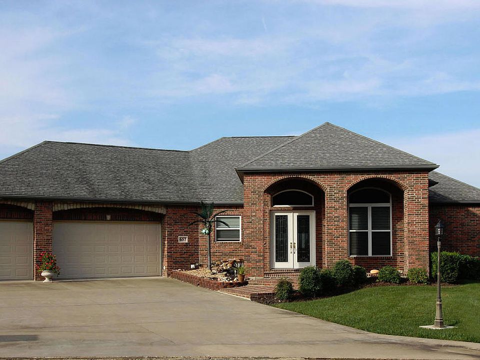 The waterfall at the front door sets the peaceful tone of this stylish Table Rock lake view home within minutes of Branson in a gated contemporary neighborhood with nice clubhouse, pool, & tennis court. Arched doorways, large nicely appointed kitchen with granite counter tops, large pantry, and beautiful cabinetry. Auto light fireplace with art niches above, architectural columns, tastefully elegant paint scheme, and multiple sets of French doors enhance the stylish quality of this home. Covered composite decks on both levels, delightful garden/flower area below. Lots of extras! SEE SPECIAL FEATURES IN DOCUMENTS Dry-dock boat storage and courtesy dock/ramp available in S/D. All measurements and square footage are approximates.
