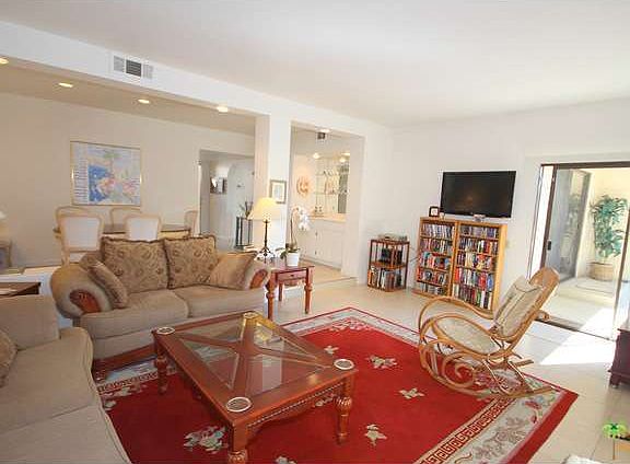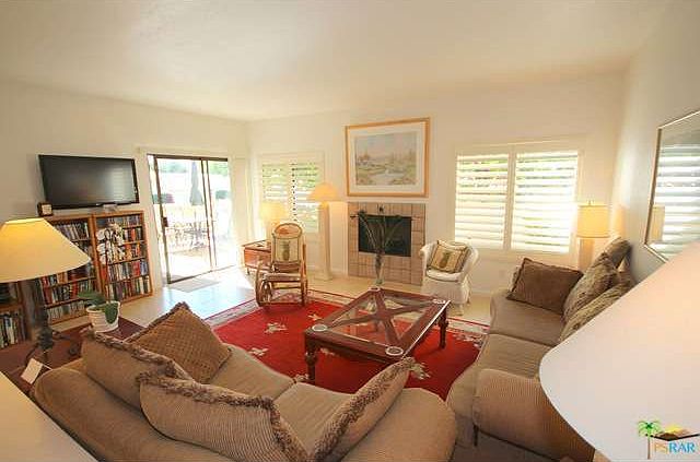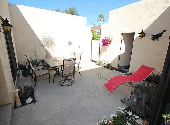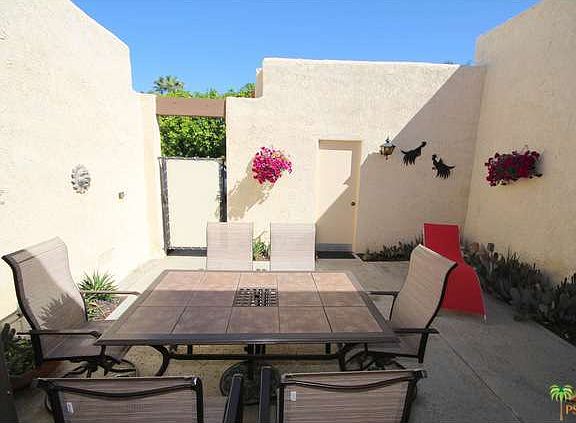 Beautifully maintained, light and bright turnkey furnished villa at St. Tropez! Just bring your toothbrush and move right in to this rarely available single story condo. The private, gated courtyard entry welcomes you to this beautiful turnkey furnished 2 bedroom, 2 bath condo boasting stainless steel appliances, tile floors throughout, 2 patios, formal dining area with wet bar and eat-in kitchen, sunken living room with fireplace, interior laundry and a 2 car garage! New appliances, Plantation shutters (2012) & new garage door and A/C & Furnace (2013). St. Tropez Villas is a wonderful complex offering resort like grounds with 4 swimming pools & spas plus 2 tennis courts just steps away from this beautiful home. Complex is located in the heart of downtown Palm Springs and is walking distance to the Casino, plus downtown shopping and dining! Leave your car at home and enjoy all Palm Springs has to offer. Your desert retreat awaits - this is the villa for you!