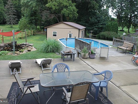 What a great property for outdoor living! The house has 3 bedrooms, 4th bedroom converted into den, 2 full baths on almost one acre. The outside has a small pond in front with patio & a larger pond outback with huge patio, part of it is covered, 17 x 33 above ground pool, basketball court, brick fireplace & large shed. Huge detached 30 x 40 3 car garage only one year old with insulated doors & ceiling. Much of the land surrounding property is protected & won't be built on. Central air, replacement tilt windows. Lower level finished with family room with built-in shelves, exercise room & newer full bath.
