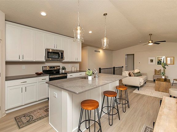 The home itself boasts a seamless open-concept design, melding the living, dining, and kitchen areas beneath soaring vaulted ceilings. The primary bedroom is a true retreat, offering a generously-sized walk-in closet and a spacious bath. Equally spacious bedrooms on the main floor ensure comfort for all. The walkout finished basement extends the living space, providing a second living area, a fourth bedroom, and a third bath for added convenience.