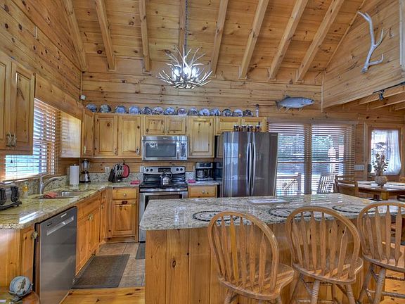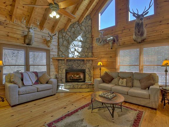 River Front Beauty! Stunning Rustic Home is close to historic downtown & recreation areas, yet tucked away on generous wooded tracttrue Craftsman Quality with Rustic Flair & Distinct Detail...3 bedroom/3 bath quaint cabin is nestled on top portion of 5 acre water front tract with towering hardwoods & lush landscape, comfortable living area boasts "sky high" ceilings & beam accents along with warm fireplace, custom cabinetry & granite counters with newer appliances & large island in kitchen, full finished terrace level w/ wet bar & guest quarters, rec room/den, multiple levels of covered porches and decks, views of surrounding mountains & storybook waterfall, gentle gathering spot at waters edge & perfect additional house building sites, easy access, fabulous firepit, carport, tastefully furnished down to the linens, just off scenic paved road in quiet & quaint community, great for entertaining with wide open layoutperfect for full time home or that much needed getaway, great established rental history!
