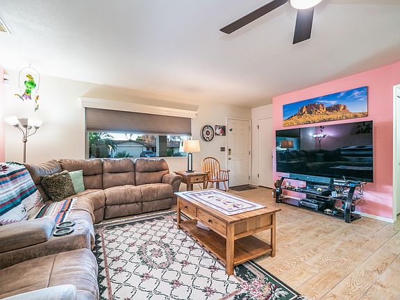 Step into this high end home that has been completely transformed from top to bottom inside & out, starting with beautiful exterior stucco, stacked stone accents on the pillars & a stunning paver entry that flows to the side RV gate & continues into the backyard. This rare NON HOA PROPERTY lets you live freely with room to park what you want without restrictions. As you approach the home, UPGRADED DOUBLE PANED WINDOWS, an UPDATED ROOF & an UPDATED HVAC SYSTEM set the tone for the care & quality poured into every detail. Inside, the solid surface wood look tile & ceramic tile floors guide you through a space filled with custom craftsmanship. The kitchen feels like a showpiece with CUSTOM KNOTTY ALDER CABINETS, FULL PULL OUT STORAGE, HIGH END APPLIANCES, GRANITE COUNTERTOPS & a CUSTOM COFFERED CEILING that adds a true designer touch. The two bedrooms offer comfortable retreats with plantation shutters dressing the upgraded windows, while the beautifully updated bathroom shines with CUSTOM KNOTTY HICKORY CABINETRY & a TILED WALK IN SHOWER. An additional Arizona room provides the perfect bonus space for an office or second living area. The OVERSIZED TWO CAR GARAGE feels like its own retreat with an INSULATED DOOR, a HIGH END WATER HEATER, a WATER PURIFICATION SYSTEM & a full additional bathroom finished with another tiled walk in shower & elegant cabinetry. Step into the backyard & you are welcomed by a PAVER PATIO, BUILT IN GAS FIRE PIT, BUILT IN BBQ, abundant citrus trees & more space than you imagined. Two RV GATES on each side of the property create parking for every toy, while two outdoor storage sheds offer room for tools, projects or hobbies. This home is truly loaded with UPGRADES & is move in ready for someone who appreciates quality, comfort & exceptional outdoor living.