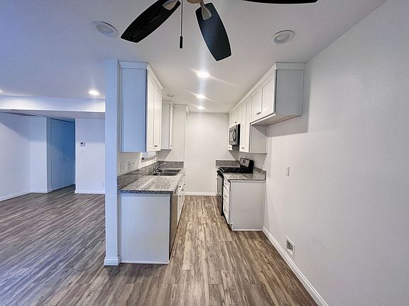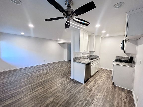 This charming ground-level unit features 1 bedroom and 1 bathroom, with stylish wood-style flooring throughout. The bright and open living and dining area connects seamlessly to a modern kitchen outfitted with granite countertops, white shaker cabinets, and stainless steel appliances, including a gas stove and built-in microwave. The bedroom includes a ceiling fan and mirrored closet doors for added comfort. With in-unit laundry hook-ups and a clean move-in-ready feel, this apartment offers convenience and comfort in a welcoming space.
