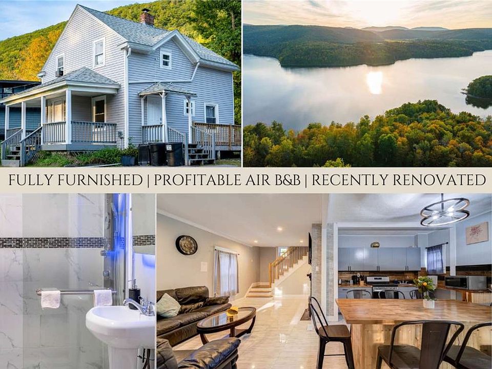 Incredible opportunity to own an affordable FULLY furnished, turn-key 3-bedroom, 2-bathroom home with stunning reservoir views, formerly the Gilboa Post Office and now a active highly rated Airbnb rental! Priced significantly below comparable properties. Thoughtfully updated in 2021–2022 with a new roof, siding, windows, electrical panel, furnace, renovated kitchen and baths, refinished hardwood and tile floors, new deck, and more. Featuring custom wood countertops, stylish furnishings, and all the essentials! Just move in or start renting right away. Located on a state-maintained road with gorgeous sunsets, abundant wildlife, and unbeatable charm. This is not one you want to miss!