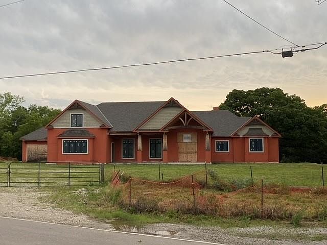 This is a large estate home needing finished with all the buyers choices on a beautiful 5 acre tract of land. This home has septic in and all utilities ready to coming into the home. It has water meter in place. Framed with roof. There are natural stone left for the landscaped backyard. This home has space for its own large movie theatre. Both Garages are suspended adding additional square ft to the home. Large mature oak trees spread out over the 5 acres of land. Paradise in town. Come check out all the potential in this home.