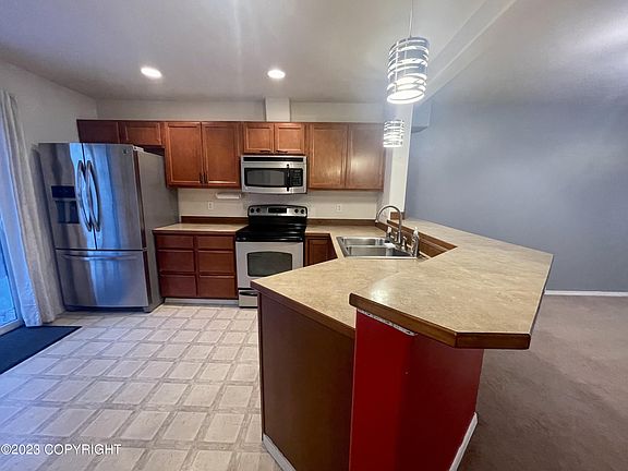 A end unit townhome close to JBER, Tikahtnu Commons, & downtown, awesome for a 1st time buyer or military couple. Open kitchen w/ a pantry, breakfast bar, & stainless steel appliances, flows seamlessly into open living & dining & to a fenced patio for pets. Spacious master w/ a walk-in closet plus 2 more bedrooms & a full bath upstairs. 2 designated parking spaces & ample visitor parking.