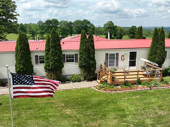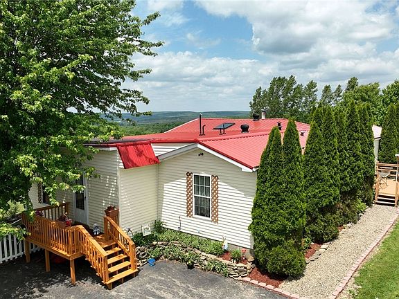 GLORIOUS PANORAMIC VIEWS AWAIT YOU - AS FAR AS THE EYE CAN SEE - A PROPERTY LIKE NO OTHER...ATOP THE 2ND HIGHEST POINT IN LYNDON TOWNSHIP - 2 manicured ponds, plenitiful perennial gardens, grape vines and ornamental trees adorn the perimeter of the expansive lawn. Rest and gather on the covered porch-very private. Play by the fish stock ponds and entertain from the picnic area-space for all. Completely renovated newer single wide mobile home with many, many upgrades-nicely done! Including spacious addition w/ all knotty-pine maintenance free interior w/ vaulted ceiling and wood stove. Off to the side is a much needed 24x40 pole barn for the outdoorsman with shop, storage, and attached large chicken coop, shed. This property is on a rural, paved all year round maintained road 7 miles from Cuba, 7 miles from Franklinville and 23 miles from Olean. 5 acres are wooded. Decks and porches freshly stained. Driveway will be resealed soon. This is a must see property!