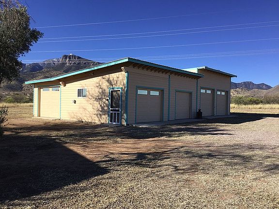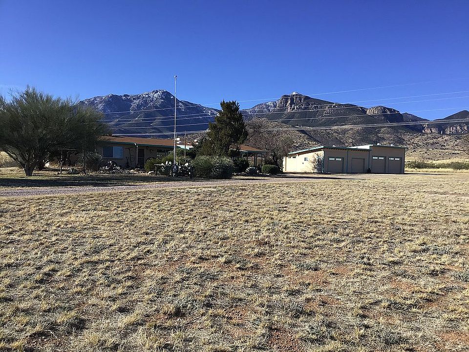 This home is set on 4-1/3 acres of country living, with fabulous views of the mountains. It is located in a very quiet neighborhood with many birds and various wildlife critters to keep you company. It is also approved for horses. It is a comfortable three bedroom, 1-3/4 bath, 1639 sq.ft. house. The living room and dining room are very open and there are views of the mountains from both sides of the rooms. There are several built-in bookcases in the living room and one bedroom. The kitchen has a large pantry. Additionally there is a screened AZ room and a utility/storage room (originally an attached garage but converted to a laundry and storage room. Could easily be used as a craft room.) Appliances included are refrigerator, oven range, dishwasher, as well as a washer/dryer set. Carport is attached to house. The garage/workshop has sufficient room for up to 5 cars plus a riding mower and bicycles. There is a 4–post lift, jib crane and large air compressor system included. Also there are 5 roll-up doors as well as 2 walk-in doors. There is a private well. We are asking $240,000, with either a conventional loan or cash. We will be happy to give you a private showing - by appointment. 520 378 4822, 520 255 1200 If you are not familiar with Hereford, AZ, it is in historic Cochise County, at about 4700’ elevation, cooler than the larger AZ cities.