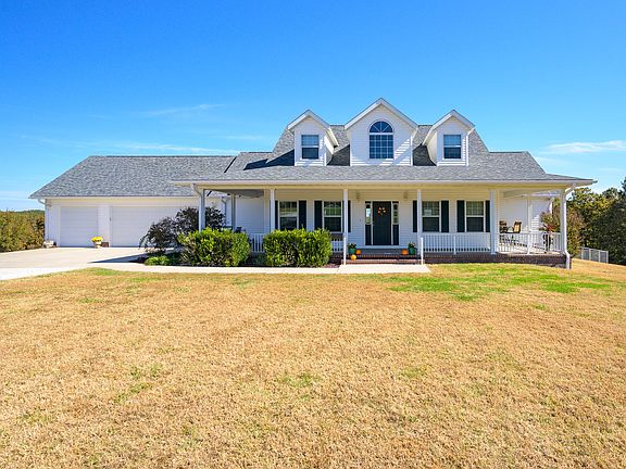BETWEEN BRANSON & SPRINGFIELD. 1-1/2 Story Picture-Perfect Country Home built in 2001 with a Wrap-Around Covered Front Porch set on 19.16 Acres m/l with incredible Ozark Hills views! Private, set back from the road, lots of wildlife, and one of the two Ponds is Spring-fed! Feel tucked away yet have easy access to multiple cities (Indian Tree Golf Course is only 4 minutes away)! Roof is new! Hot Tub and Above-Ground Swimming Pool are included. NO RESTRICTIONS!