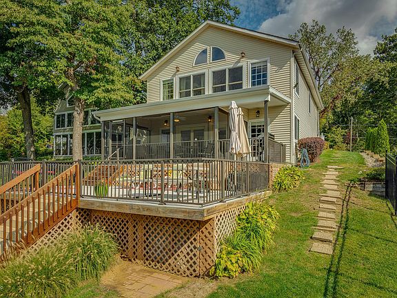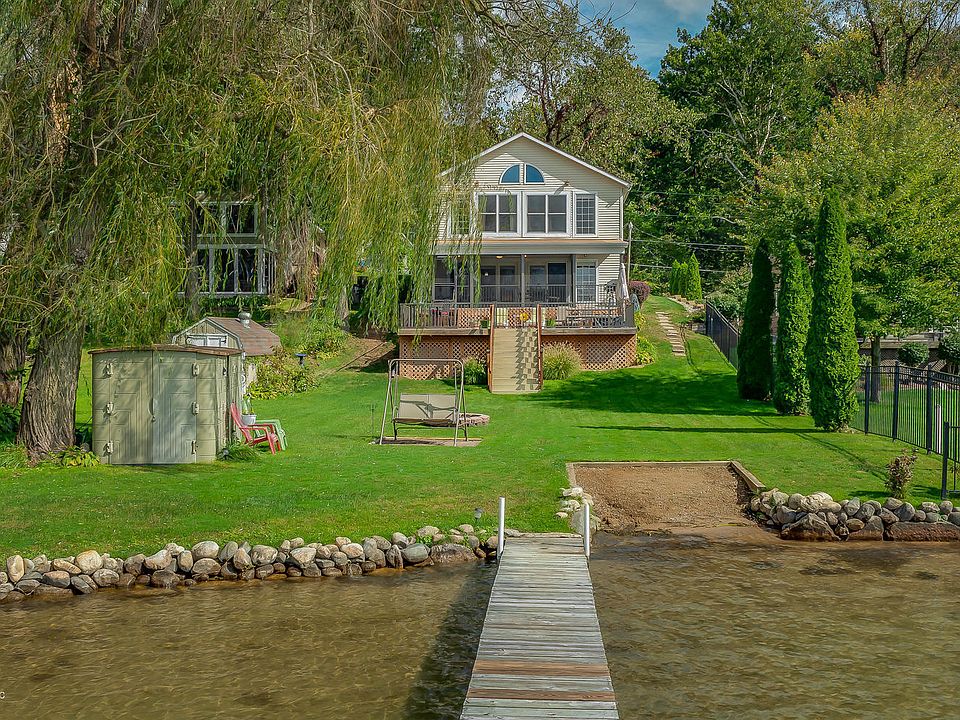 This 3 BD 3 BA 2,340-sq-ft home overlooking Shavehead Lake comes with magnificent views of water, woods, and sunsets, a large screened porch, lakeside deck, and fenced-in back yard. The house, built in 2006, has updated features including new geothermal heating and cooling and smart thermostat. Open-plan downstairs: kitchen with stainless steel appliances, dining area, family room, large-window lake views, access to screened porch. Also downstairs: 1 BD, 1 BA, laundry, utility room. Upstairs: master suite, bath with dual vanities, and 2 walk-in closets; second suite with private bath; living room. 6 ceiling fans. Outside, grassy lawn, sandy, shallow beach entrance, private dock. Yard between house and two-car garage is fenced. Abundant overflow parking available on lot across back street.