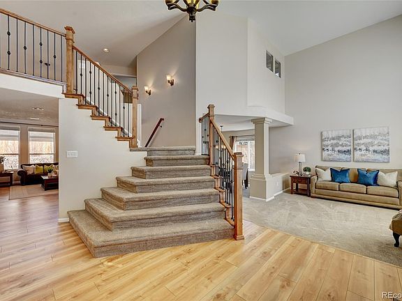Don’t miss this meticulously maintained home in East Highlands Ranch with soaring ceilings, large loft and beautiful upgrades throughout. This 5 bedroom, 4 bath home is bright & spacious on a welcoming corner lot with mature trees providing the best privacy and ample space for outdoor activities. As you walk in the 2-story foyer, you will notice all the natural light, new floors and the grand staircase with elegant railing and iron balusters. The floorplan allows for family gatherings and space for hosting with the expansive eat-in kitchen with large island that flows into the family room featuring a gas fireplace and stacks of windows. Around the corner you will find the large home office that could double as a guest suite with a ¾ bath down the hall. The upstairs boasts beautiful new hard surface flooring throughout leading you to the spacious loft with amazing overlook. The primary bedroom has a spa like bath, dual closets, and double vanity is sure to please. 2 additional well-sized bedrooms and a full hall bath finish out the upstairs. The downstairs is just as impressive with plenty of room for entertaining or an overnight guest. The stairs lead you to the open bonus area, a large full tiled kitchen with sink. The large 5th bedroom, 4th bath, and huge additional walk-in pantry is everything you need to complete the 1200 sq ft finished basement. Other amazing new features not to miss include the brand-new floors throughout, updated windows and blinds, new concrete drive and fabulous covered back patio with walk, new back fence, exterior paint, new water heater, sump pumps, new dishwasher, and the list goes on. The architectural style really makes this home special by showcasing the openness and functionality. The location adds the final piece, conveniently located near trails, shopping, Park Meadows Mall, many restaurants, and 470...this home will not disappoint.