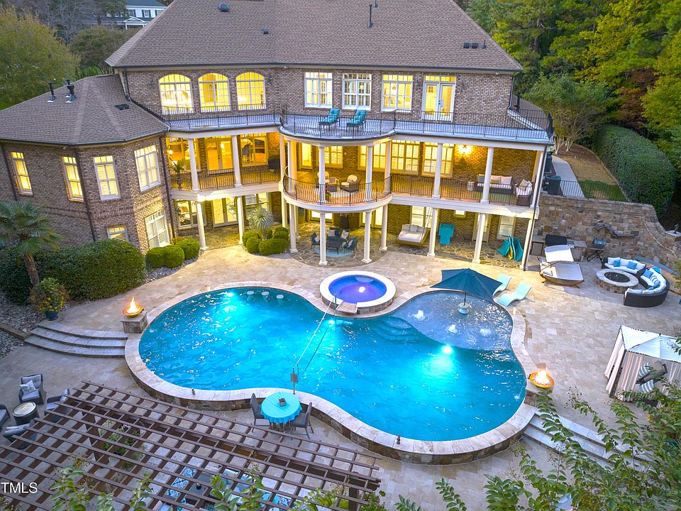 Over $150,000 in IMPROVEMENTS - Experience Unparalleled Luxury in this Stunning, Expansive, Custom Executive Private Sanctuary Estate, boasting 8,440 Sq. Ft. of Open Floor Plan. This Beautifully Renovated brick & stone Estate is set on nearly 2 VERY PRIVATE acres & features 5 spacious bedrooms, 3 gas fireplaces, bonus room, 2 kitchens, recreation room, custom office, & a finished in-law suite with a separate entrance. Nestled in the prestigious Wakefield Estates Community, just minutes from downtown Wake Forest and Raleigh, this home provides multiple comfortable living spaces both inside and out. Nature is your neighbor in the outdoor area, featuring a Resort-Inspired in-ground saltwater heated pool and Jacuzzi that can be enjoyed year-round. The pool area is enhanced by Fire Bowls at each end, with waterfalls gracefully flowing from the sides and soothing bubblers, along with a spacious hot tub, built-in grilling station, refrigerator, fire tables, custom fireplace under a charming pergola. Multiple separate seating areas w fire tables are scattered throughout the backyard, & the shaded veranda offers an ideal spot for relaxation or hosting, overlooking a stunning backyard oasis. The Front Yard is Large and Beautifully Landscaped. The lower level, which overlooks the entire backyard pool area, includes a large bedroom w/ new custom shutters & a full bathroom, making it perfect for a multi-generational living area, in-law suite, or guest bedroom. It features a fully equipped second kitchen w/ a refrigerator & wet bar, an additional laundry closet, plenty of extra storage space, & a pool room for supplies. A beautiful stone gas fireplace graces the second family room, while the expansive rec room offers a pool table, air hockey, dartboard, ping pong table, foosball, poker table, a newly renovated movie theater room, a newly renovated exercise room, a half bathroom, and extensive storage, making it an Entertainer's Dream! On the main floor, you'll find a Grand Entrance with a soaring two-story foyer featuring a custom wood coffered ceiling, a cozy living area with a gas fireplace, and a Romeo and Juliet balcony overlooking a Self-Playing Piano. The spacious, elegant owner's suite includes a seating area, trey ceilings with custom molding, a gas fireplace, and a lavishly remodeled bathroom with dual custom walk-in closets and shelving throughout. The owner's suite offers views of the resort-style pool area and provides direct access to the rear balcony. The fully renovated high-end gourmet kitchen features a Wolfe gas range, double ovens, warming drawer, Sub Zero refrigerator/freezer, a large pantry, and a generous kitchen island that opens to the Spacious Dining Area and Family Room; Perfect for Entertaining! An Impressive Office with built-in shelving overlooks the beautifully landscaped front yard, and custom shutters are found throughout. Enjoy instant hot water with a whole-house water filtration system. Expansive outdoor decks span the entire back of each floor, providing Breathtaking Views of the Incredible Backyard with the Custom Pool & Jacuzzi! The Third Floor features 3 bedrooms, each with its own full bathroom, and a bonus room. The spacious walk-in attic offers abundant storage space and is ready for customization. This Estate includes 5 bedrooms, a bonus room, two dedicated offices, a workout room, a movie theater, generous storage, and a completely renovated 3-car garage with NEW Marble epoxy floors & a workshop area, offering everything needed for Upscale Living. There's even a Basketball Court in the Large Driveway area in front of the 3 Car Garage. With Only County Taxes! One-Year Home Warranty conveys to buyer. Conveniently located near the Wakefield Plantation Golf Club just a short golf cart ride to the course, this property is also near Falls Lake, Forest Ridge Park, & Historic Wakefield Barn. This home truly blends sophistication, convenience & exceptional space for family gatherings! Welcome Home!