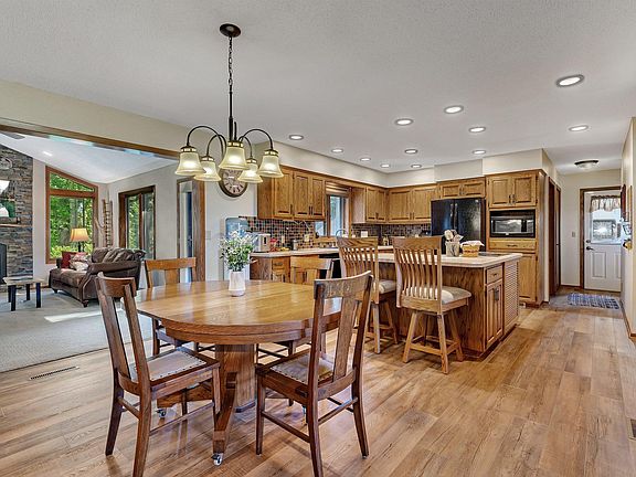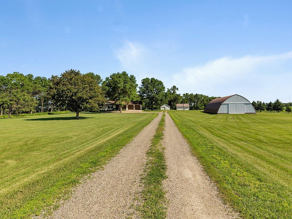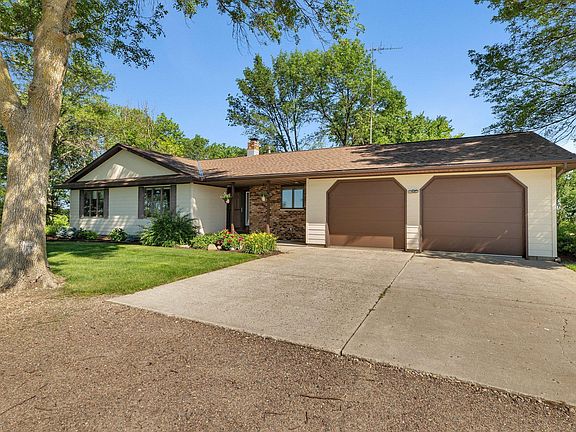 Private 4 bedroom, 3 bath rambler on 7.21 acres with many outbuildings for storage! You will love the park like setting in the backyard along with the large deck, concrete patio and firepit. The home has been very well cared for with several updates: awesome sunroom addition, main level flooring, countertops, washer & dryer, and roof & James Hardi siding. Upper level has two bedrooms and two baths, huge sunroom w/gas FP, living room, laundry, and spacious kitchen. The lower level offers two family room areas (one w/fireplace), exercise/music area, bath, and storage. Dual fuel-forced air heat and baseboard backup. Quanset: 40x80x20, Grainery: 14x26, Shed: 20x20. Andersen windows. Same owner since 1992. Very well cared for!