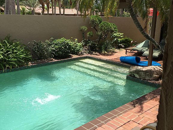 LUSH AND TROPICAL, find serenity and ultimate privacy in this spectacular Mediterranean one-story pool oasis home. Pavered driveway and elegant gate open up to a wonderful tropical courtyard with secluded LARGE SPARKING POOL and FOUNTAIN. Masterfully designed with everyone in mind, this impeccably maintained 3 bedroom, 2 bath home surrounds pool with 5 sets of sliding doors providing for a truly seamless indoor/outdoor experience. The COURTYARD pool functions as an open-air living room, a garden extension to the rooms of the house. From the courtyard, step into the stone pebble foyer and let your breath be taken away by a centrally located outdoor fountain clad in stone and teak which many interior rooms share. RELAXING. STRESS RELIEF - TRANQUIL SOUNDS MAXIMIZE YOUR COMFORT.