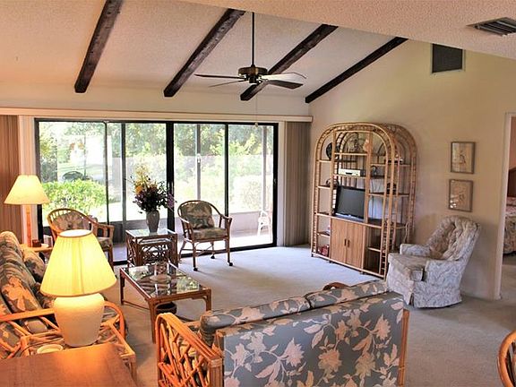 Welcome to this great end unit condo in sought-after Sunrise Golf Club! This ground floor unit has beautiful water views out the front and rear with a patio on each side as well. Relax on your rear screened and covered lanai in total privacy and watch the wildlife. Inside, this condo has vaulted ceilings for an added feeling of spaciousness, inside laundry, two-sided breakfast bar, and split plan en suite bedrooms. There is loads of storage inside and plenty of sliders out to the outside. There is a one-car carport and comes with a storage closet. This unit comes turnkey furnished as well! Sunrise has an excellent location about 9 minutes to Siesta Key and 2 minutes to I-75. The community is very well-maintained and features tennis and year-round heated swimming pool. Welcome and enjoy...