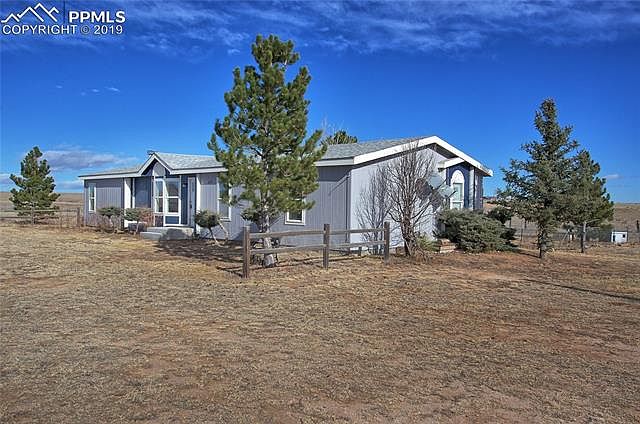 Wonderful large 4 bedroom, 2 bath 1702 square foot home with very open ranch floor plan on 35 acres 10 minutes south of Calhan. Home features an open floor plan with four large bedrooms and two full baths. The large kitchen offers laminate hardwood flooring, two family room areas, large master suite & 5pc bath. Fenced in area for the back yard. Experience the wide openness of the area on your own 35 acres.