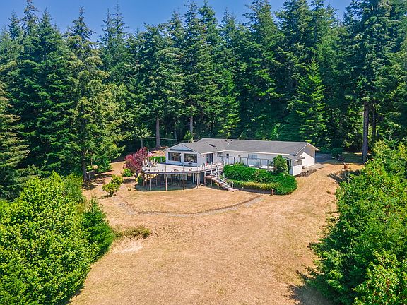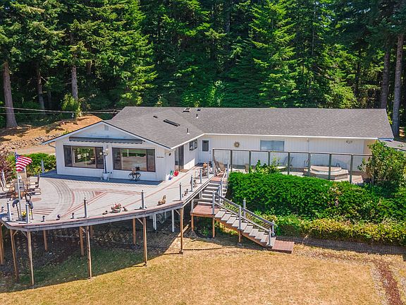 Gorgeous North Bend bay view home nestled amongst the coveted East Bay location. Completely private stunning setting with manicured trees and grounds. Home boasts over 2,600 square feet with 5 bedrooms and 2 full bathrooms, large vaulted living room upstairs and huge family room downstairs, laundry on the main level, tons of storage, 3 car attached garage with separate workshop space, brand new roof, and amazing trex decking in the shape of the bow of a boat! Unique design to enjoy the big BAY/BRIDGE VIEWS! Two additional tax lots included. Tons of parking. Amazing space inside and out! This property is a must see! Schedule your private viewing today. No drive bys please!