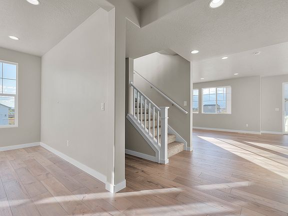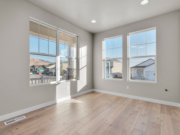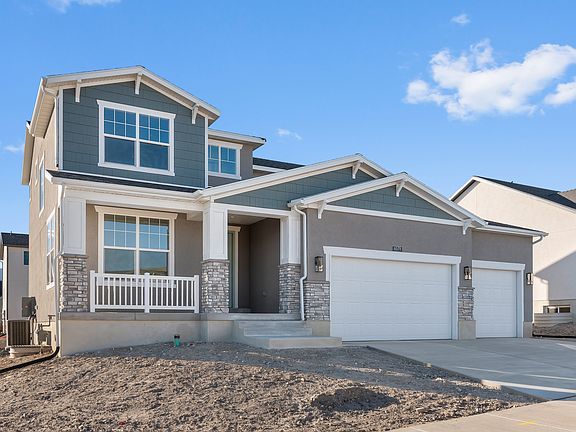 Brand new 2050 Craftsman home plan situated in a beautifully master-planned community in Eagle Mountain! This home features white laminate cabinets, quartz countertops, and stainless steel gas appliances, delivering a sleek and modern cooking space. The flooring includes a blend of laminate hardwood, vinyl tile, and carpet, offering a mix of durability and comfort. Notable design elements include a 3-car garage with a keypad for convenience, a box window in the kitchen nook, and can lighting throughout for a bright atmosphere. The home is also equipped with Christmas light outlets, a 40-gallon water heater, and energy-efficient options for cost savings and sustainability. Craftsman base and casing details add a touch of elegance, while 2 tone paint and the wood railing at the stairway enhances the traditional feel. In the owner's bathroom, cultured marble shower surrounds create a spa-like environment, complemented by brushed and satin nickel hardware. Come check out this home that offers a perfect balance between classic craftsmanship and modern amenities today!