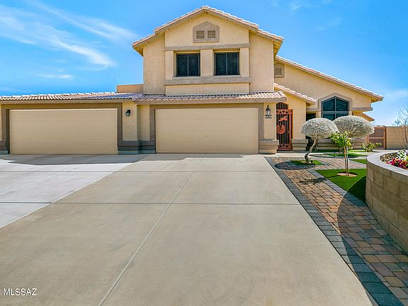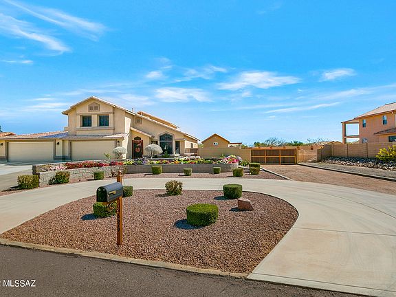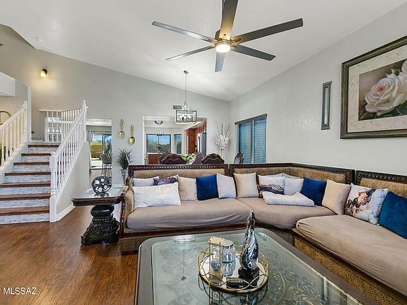 Wow $20K price reduction! The light & bright home is immaculately maintained & offers a 1st floor den (no closet) that could serve as a 5th bedroom w/ adjacent 3/4 bath. Updated flooring with wide plank Pergo floors in main areas including bedrooms, hallways & turn staircase. Travertine tile floors & moldings in laundry room & all 3 baths. Open concept floor plan with Kitchen open to Family Room & Dining/Living room. Newer gas range & Bosch SS interior dishwasher. Corian counter tops Spacious 2nd floor Master has en suite bath w/ shower & soaking tub. Large covered porch with mountain views to the N & SW. Block fence with wrought iron view fence at back to the remainder of lot beyond. 2 double gates for access to add a 3rd car garage/pool.Screen Master Security Solar Screens on ALL windows Lot extends beyond fence to road behind. Newer concrete circular drive adds parking space for guests out front. Irrigation system in front. Termite Warranty and 1 year 2-10 Home Warranty included. Well maintained home from top to bottom. You won't be disappointed. No HOA!!