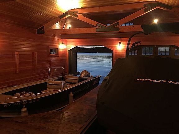 Two story waterfront four season home with 3,240 square feet of finished living spare. Four bedrooms and bunk/recreation room with beds for 12. Remodel/design elements added in 2012 by architect Nils Lunderowski. Boathouse with fireplace designed by Nils Lunderowski added in 2012, approximately 1,200 square feet excluding deck/dock area. Sperate two car heated garage of 520 square feet.