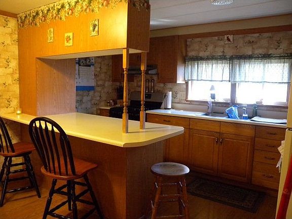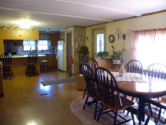 This home was a single wide. Everything has been completely redone. The only thing remaining is the steel frame under structure. Oak cabinets in kitchen with breakfast bar. Laminate flooring in dining room. Living room has knotty pine ceiling with patio door to deck and above ground pool. Large closet in master bedroom. 10x11 deck out back. Storage shed in back yard. Addition was done in 1987. Insulated and sheet rocked. Cute as a button.