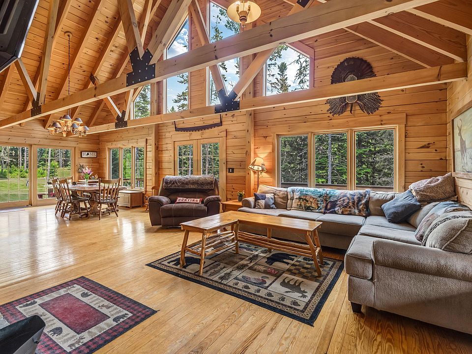 Panoramic viewsPrivate winding drivewayLog-sided exteriorGrand cathedral ceilingsIron bracketsGranite countertopsGlass french doors