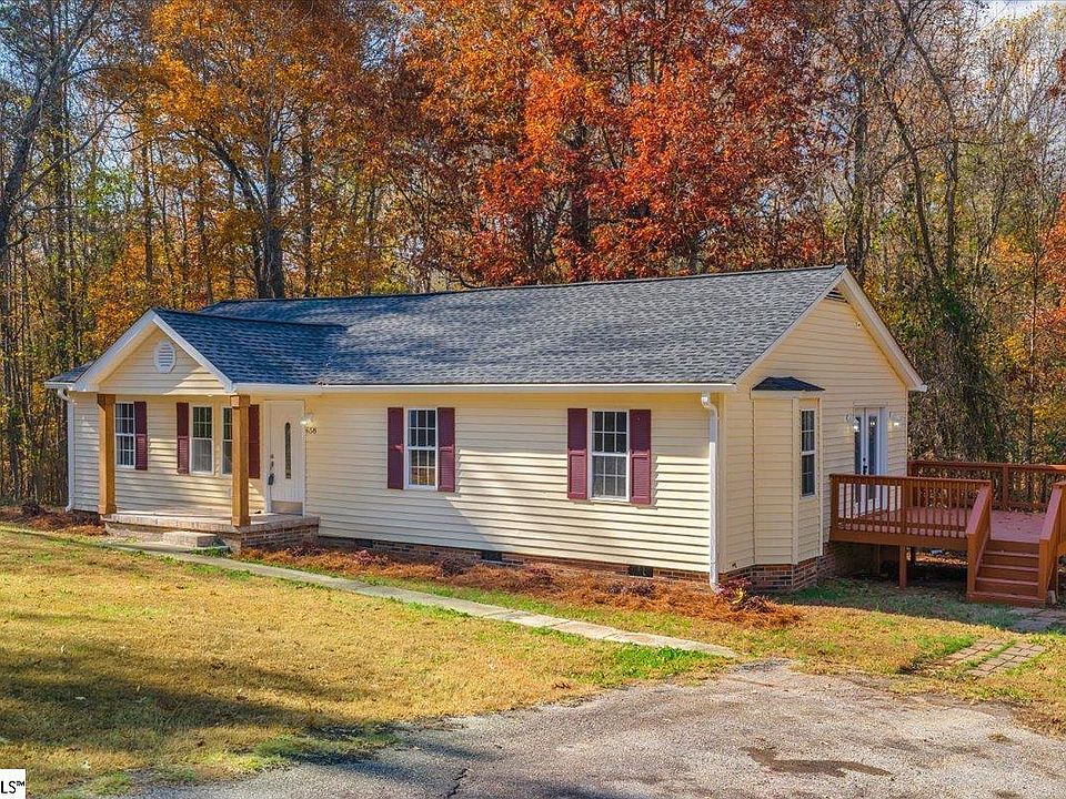 Discover simplicity and style in this freshly remodeled one-level home, featuring 3 Br, 2 Ba, on a generous 1-acre lot, just 15 minutes from Downtown Laurens or I-85. Recent upgrades include a new roof, windows, HVAC, and refreshed interiors, creating a like new home. The kitchen adds a touch of elegance with tile floors, new cabinets, granite countertops, and a subway tile backsplash. The master suite offers a stylish tile shower, and a spacious deck invites you to unwind overlooking the peaceful wooded backyard. Embrace the charm of quiet country living at an affordable price. Welcome home to comfort, affordability, and style.
