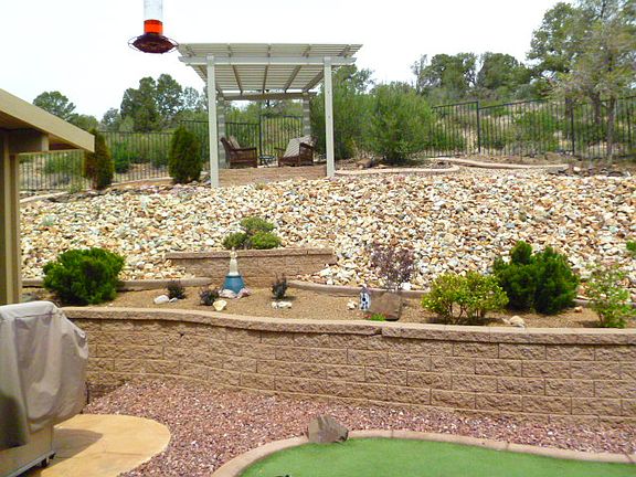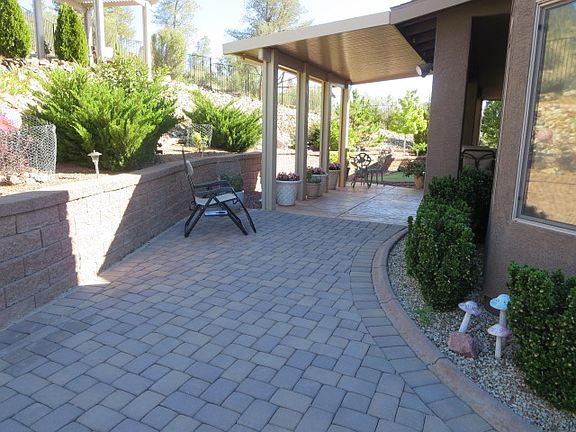 Custom Szabo home for sale located in desirable Creekside of Prescott! Great location with BLM land on three sides! Split plan with open concept. Great-room with tall ceilings, double-sided stacked-stone fireplace, and solid flooring; A generous kitchen with maple cabinets and dining area boasting T&G cedar ceiling. Master Suite with jacuzzi tub, snail shower. Two secondary bedrooms, secondary bath and recessed alcove perfect for home office! Impressive outside space, perfect for entertaining! A terraced backyard with low-maintenance grass (perfect as putting green), long covered patio with Jacuzzi, center fireplace, lanai & gazebo. Metal fencing with a private gate providing access to hiking trails! Two car garage, storage, under house workshop PLUS an additional motorcycle garage!