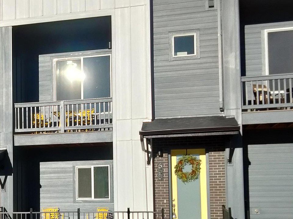 Why wait for construction! New Townhome w/$3K move in allowance. Opening directly to the park. Lovely patio/w chairs at entry level. Come in to an office cubby area and 1/2 bath. 2nd floor main living space--open floor plan--large kit/dining and living area adjusting to your lifestyle. Electric LR fireplace. Covered deck off the LR. w/furniture. 2 lg. bedrms with private baths and Laundry at the next level. A total of 4 baths. 2 car gar. attached. Leed Certified, w/solar. No HOA saves you big $.