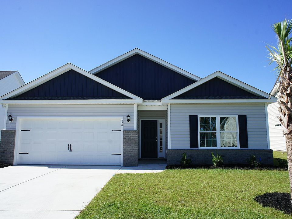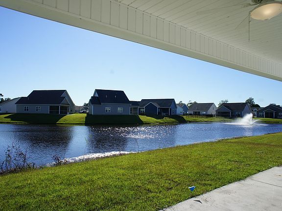 Drive your golf cart to the beach from this beautiful Topsail floor plan on a fantastic pond-front lot by the local builder voted Best of the Grand Strand for the second consecutive year! In the Ocean Palms community (Voted Best Neighborhood!) and ready for you. This terrific open floor plan, 3 bedroom, 2 full bath home has wood-look LVP flooring throughout - no carpet. Stainless appliances, staggered-height grey painted Shaker-style cabinetry and a marble-look quartz breakfast bar with a cast iron farm sink combine to give you the wow factor you're looking for. Abundant recessed and pendant lighting plus two large windows, two accent windows and a full-glass double French door flood the room with light. The French door in leads to the huge covered porch, which extends behind the owner's suite, with a separate patio beyond, all overlooking the pond. The spacious owner's retreat features a long vanity with dual undermount sinks in a quartz counter, an oversized walk-in shower, plenty of storage in the linen closet and 2 huge walk-in closets, plus a tray ceiling. Another set of double French doors from the owner's retreat also leads to the covered rear porch, and two accent windows will frame the location of your bed. Two additional bedrooms and a full bath are tucked off on their own hallway, for privacy. All of the homes in Ocean Palms come standard with the luxury and efficiency of natural gas (tankless water heater, gas heat, and a five-burner gas range). The two car garage is completely trimmed and painted, with a wifi-enabled garage door opener, and the floored attic storage space is accessed by drop-down stairs. The fully sodded yard has an irrigation system, front and back. Ocean Palms is conveniently located near shopping, restaurants, schools and world class medical offices and hospitals, and only a short golf cart ride to Surfside Beach's gorgeous beach and the beautiful Atlantic Ocean. Other floor plans and inventory homes may be available. Community Pool and cabana!