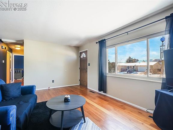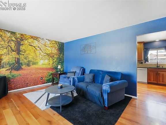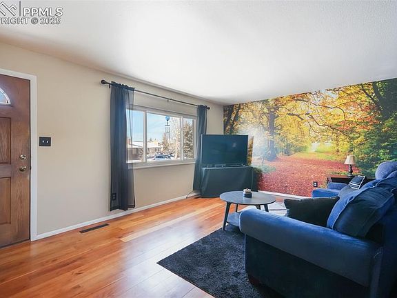 This beautifully maintained ranch-style home is a rare find, offering four bedrooms, three bathrooms, and breathtaking Pikes Peak views. Step inside to discover wood flooring throughout, adding warmth and elegance. The main level features a spacious primary suite with an attached three-quarter bath, a second bedroom, and a full bathroom. The eat-in kitchen comes fully equipped with a gas cooktop, microwave, dishwasher, and refrigerator—all included—ensuring it’s move-in ready. Downstairs, the finished basement offers a comfortable living area, two additional bedrooms, and a full bathroom. A large laundry room doubles as extra storage space and includes a convenient wash sink, water softener, and humidifier. Enjoy year-round comfort with a newer furnace, air conditioning system, and water heater. Outside, the expansive backyard provides plenty of space for relaxation and recreation, perfect for entertaining or enjoying quiet evenings with mountain views. The attached one-car garage adds convenience, and the home’s thoughtful upgrades make it an exceptional value. Schedule your showing today and make this well-loved home yours!
