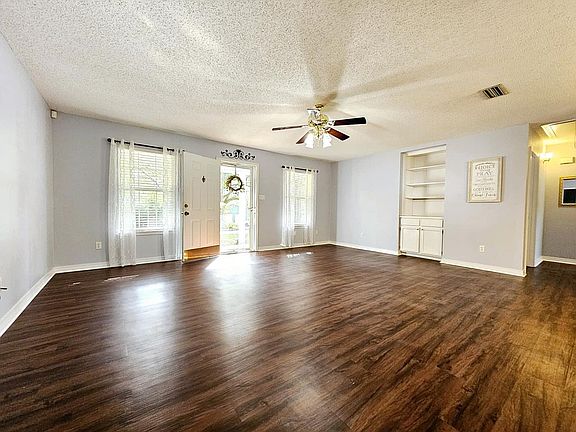 There is so much to love about this beautiful home! Walking into the home, you will love the bright and airy open floor plan. The kitchen and dining areas open into the large living room with built-in bookshelves, all with luxury vinyl wood plank flooring. The master suite includes a walk-in closet and private bath. On the opposite side of the house are two additional guest rooms and a full bath. The spacious back yard is privacy fenced with a relaxing patio, storage building, great producing satsuma tree, as well as hidden double gate access to the backyard from the driveway. The lot across the street is wooded providing lots of privacy. A new HVAC system was installed in 2018, new septic field lines in 2019, a new water heater and bronze certified roof in 2021, and new carpet for all bedrooms in 2024. The home sits on a peaceful street conveniently located just 6 minutes from the interstate, with both public as well as private elementary schools only 4 minutes away.