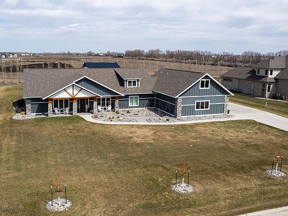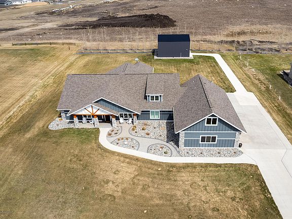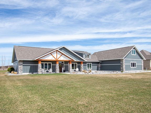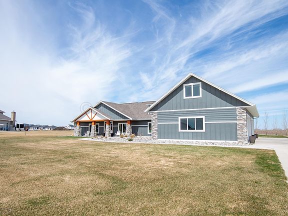 OPEN HOUSE Saturday 12-4pm! One level living at it's finest! This beautiful, custom home is situated on a 1 acre lot in the Adelman addition of Horace! Enjoy 4 bedrooms, 4 bathrooms, 3600 sq ft of living space, a 4 car garage, as well as a 24x32 outbuilding! You'll love the 12' vaulted ceilings in the great room, floor to ceiling stone fireplace, open floor plan, custom kitchen, and a private primary suite with a large bathroom and walk-in closet. Above the garage is a spacious bonus room with a kitchenette and 3/4 bath! Outside features include professional landscaping, covered front porch + back patio, storage shed, and a ton of room to play. The 4 car garage is finished and heated with screen doors and an entertaining space! ICF slab on grade(no flooding!) with a concrete storm shelter.