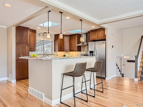 This immaculate home is move-in ready and no expense has been spared in the updating and remodeling that has been done. The open floorplan connects the spacious living room, dining room, huge outdoor deck and kitchen, making this layout perfect for entertaining. The kitchen features granite countertops, new glass skylights, new lighting, SS appliances, new dishwasher, under cabinet lighting, vented hood, and a tasteful tile backsplash to complement the granite and gorgeous dark cabinetry. Hardwood floors flow through the home, carpeted stair runners and crown molding have been added, and new window treatments ensure your privacy. Smart features include an Ecobee Thermostat, doorbell camera, and security cameras. All electrical and plumbing systems have been updated throughout, and even the outlets and light switches have been upgraded, along with all the lighting and 4 high-end ceiling fans. Doors, windows, storm doors, and closet doors have been replaced, and the property boasts both central A/C and a swamp cooler, so you can save on energy bills, or opt for maximum comfort through summer. The large laundry room has a new drain, new tile, and includes the washer, dryer, and laundry sink. Roman shade blackout curtains have been installed in the bedrooms, and the closets have automatic lighting. The exterior has recently been painted with Rhino paint(25-year warranty). The massive professionally landscaped yard complete with a large storage shed with electricity, RV/camper/boat parking, off-street parking, front and rear sprinklers, new sprinkler valves, new fencing, a reinforced new gate, and mature trees, enjoying the large covered deck and private outdoor space will be a theme for your enjoyment from day one. Located in Littleton School District, with easy access to DTC, the mtns or foothills, Downtown, Goodson Rec Center, deKoevend Park, and restaurants and retail stores nearby.