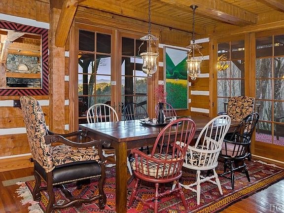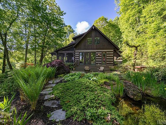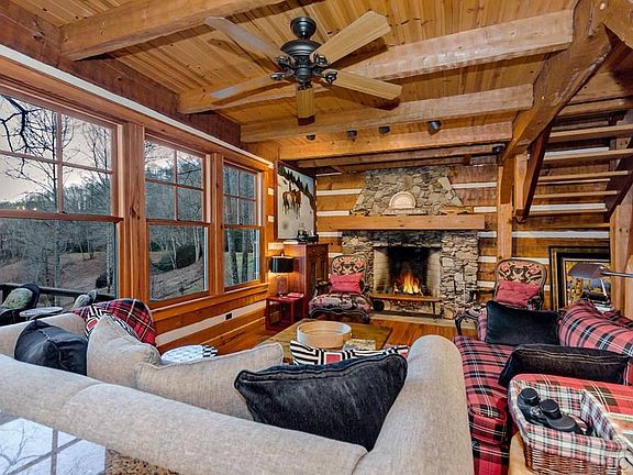 On 23 beautiful, unrestricted acres in Tartan Glenn Farms sits a true post and beam log home with chink siding, evoking fond memories of laughter, games, and sipping cocoa by the fire while spending holidays and vacations with family. Offering plenty of privacy and land to explore, this is the quintessential mountain getaway for now and generations to come. Past the gated stone entrance, a scenic meandering drive leads to paradise, with gorgeous long range, layered mountain views, rolling pastures and the relaxing sounds created by the water feature and falls that have been added, including three ponds. An open deck and screened porch invite outdoor living in the fresh air and peaceful setting. Inside, a terrific kitchen with stainless steel appliances, barn red accents and a breakfast bar opens directly to the living and dining area. The primary suite is on the main level, along with a laundry/mud room area and a wine storage room. Upstairs are two guest suites and a second living area. Over the garage is the fourth bedroom with its own full bath, kitchenette and private entry. Located near Lake Glenville, this very special property also has walking trails, flower gardens, raised vegetable beds and fruit trees. Inquire on how lake and dock access can be created within close proximity of this property